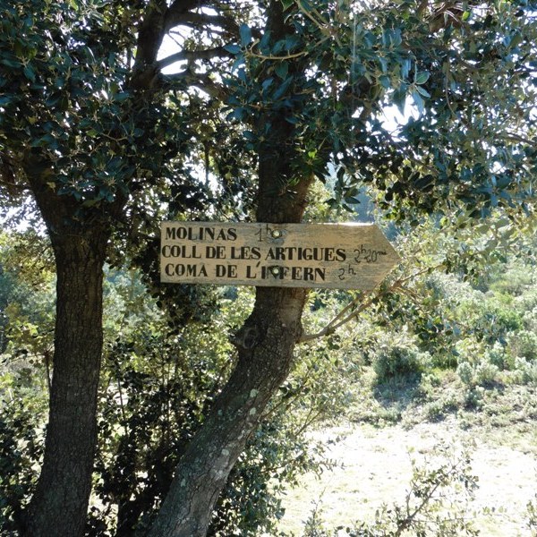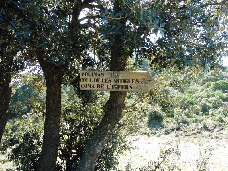 Assolim una agradable collada herbosa amb un pal indicador clavat en una alzina que ens marca que cap a ponent som a 1h de Molinàs, a 2h de la Coma de l’Infern i a 2h20min del Coll de les Artigues, aquests dos indrets situats a la Serra de la Balmeta.
