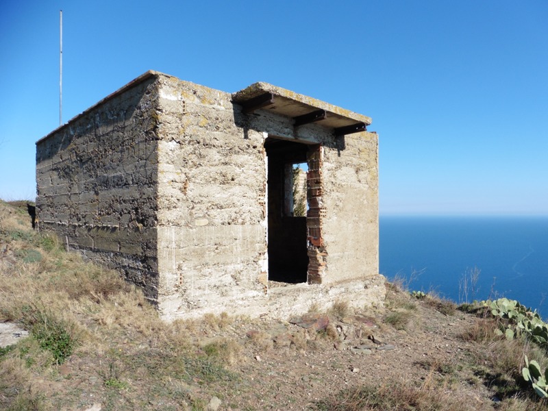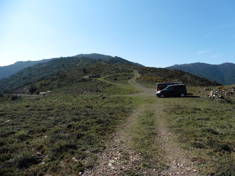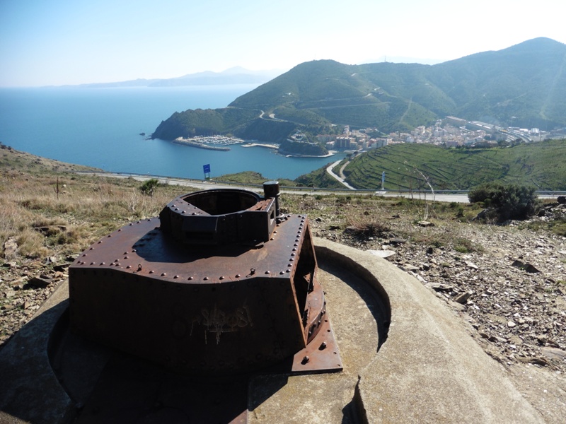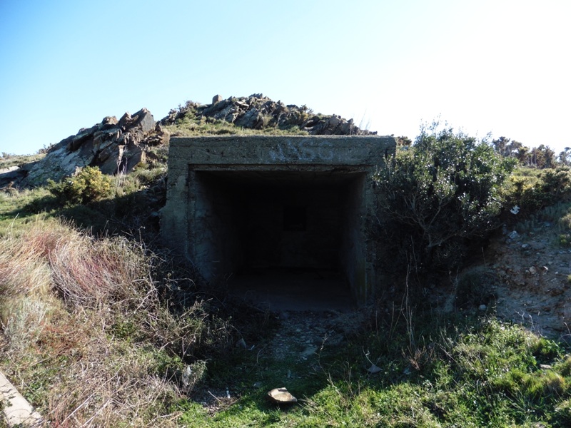 Del cim del turó podem optar a anar fins al coll del Frare per una pista que va pel vessant nord de la carena, amb vistes a Portbou, i que passa per l’entrada del búnquer. També podem passar pel sud (esquerra) seguint un corriol que creua les antigues edificacions.