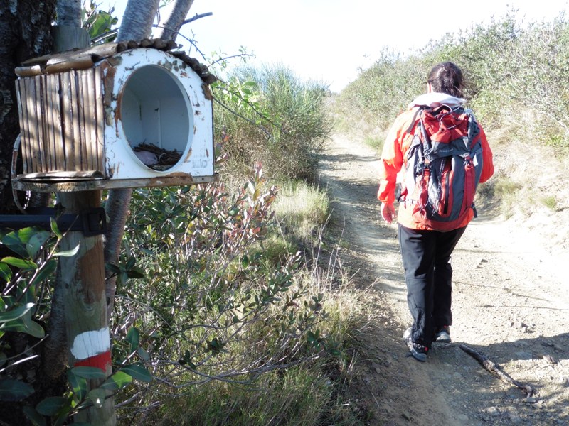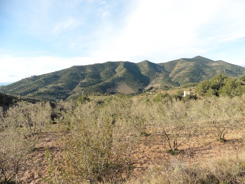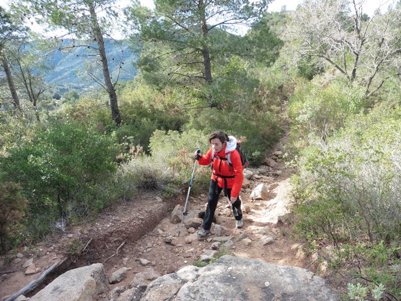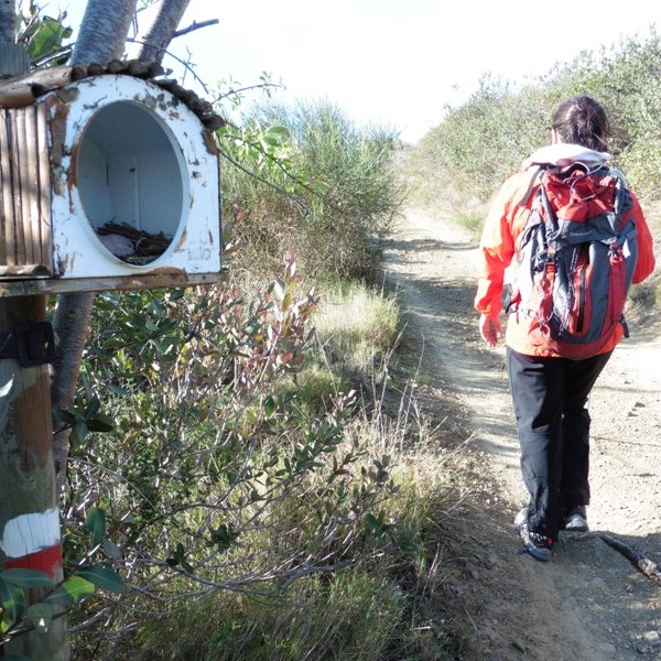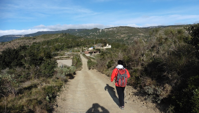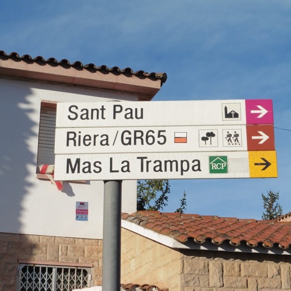 Un senyal de trànsit (sic) ens marca la direcció del GR-65.5, sender que ens porta a passar pel costat del cementiri i a creuar la Riera de la Selva. El camí, amb alguns avorrits trams cimentats, puja per Lo Mas d’en Valls, una zona agrícola d’oliveres, garrofers i avellaners.