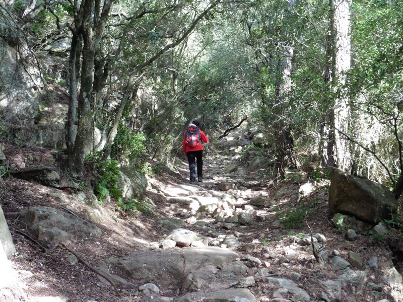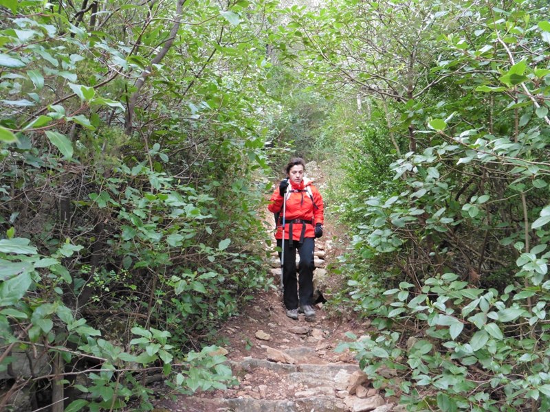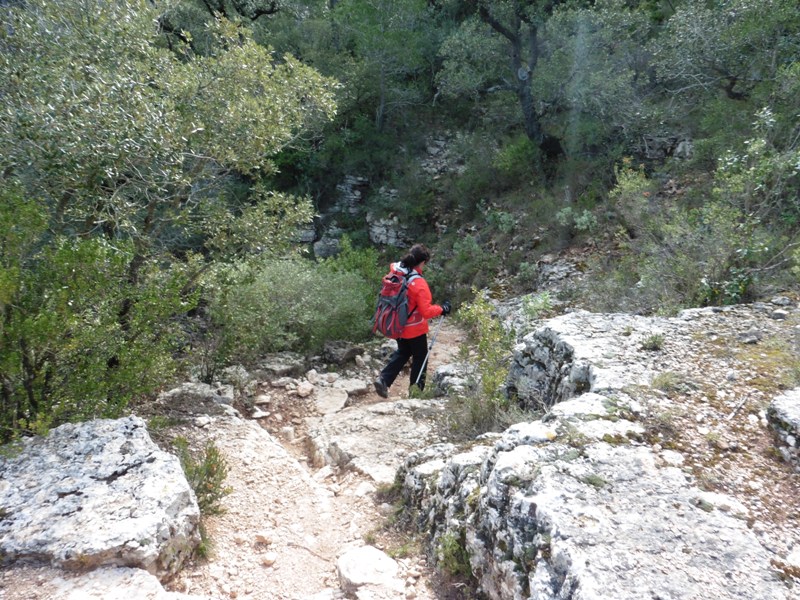 La baixada fins a la font de l’Irla és la part més interessant de la travessa. El corriol baixa pel Coster de les Carabasses zigzaguejant cap al fons del barranc de l’Albiol (riu Micanyo) per un camí que va entre un espès bosc que no ens deixarà observar amb claredat els esvelts cingles de la Serra del Pou que tenim a davant.