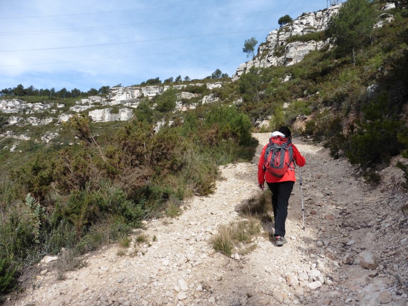 Deixem el camí de la Pedrera que segueix recte per prendre a l’esquerra una segona pista que flanqueja plana sota el vessant sud del Tossal de les Forques (503 m). Reconeixerem la cruïlla pel pessebre que hi ha dins de la resta d’un electrodomèstic CATA a l’esquerra del camí. El sender segueix una còmoda pista carenera en lleugera pujada amb vistes al Castell de l’Albiol, encimbellat dalt d’un turó.