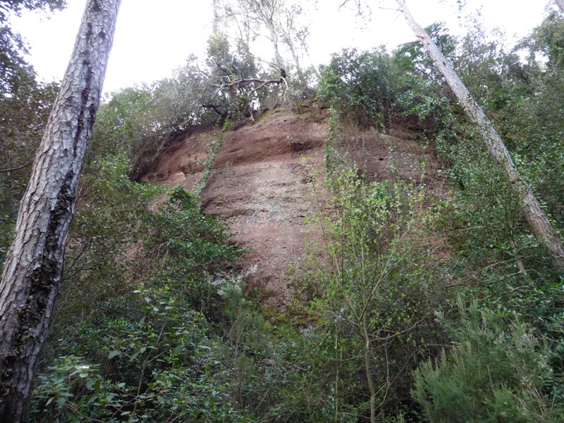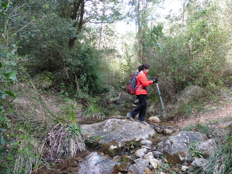 Un cop al fons del barranc, seguim el corriol que va pel marge sud del torrent entre una espessa vegetació que contrasta fortament amb la que teníem de pujada a l’Albiol. De tant en tant trobarem afloraments de roca vermella del Buntsandstein (triàsica), fàscia geològica que estem travessant. Deixem un camí a l’esquerra que creua el torrent per continuar recte per un tram de sender estret i incòmode però força bonic que va a tocar de petits tolls que forma el torrent en aquesta part del seu recorregut.