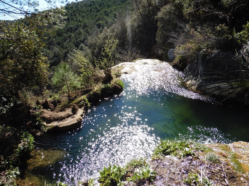 Nosaltres continuem pel camí principal (PR) durant 50 metres més, quan trobem un trencall a l’esquerra que ens porta a visitar un altre bonic toll d’aigua del riu Glorieta. L’inici és una mica perdedor per la multitud de corriols que van entre la pineda. Els camins van a parar a un esperó rocós que esdevé excel·lent mirador de la vall. Des d’aquest punt davalla el corriol, força dret, fins al toll. La baixada és fàcil però caldrà ajudar-nos de les mans.