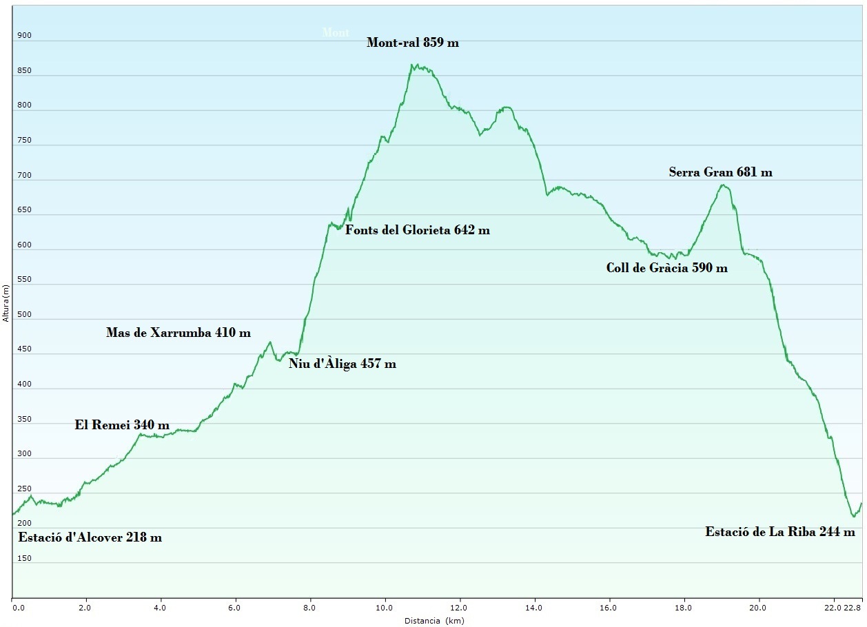 Des de Mont-ral abandonem el PR C-20 que continua cap a Farena (5,4 km) i Cogullons (10,8 km), per prendre ara el GR-7, sender de gran recorregut que ens portarà fins a La Riba en 12,3 quilòmetres.