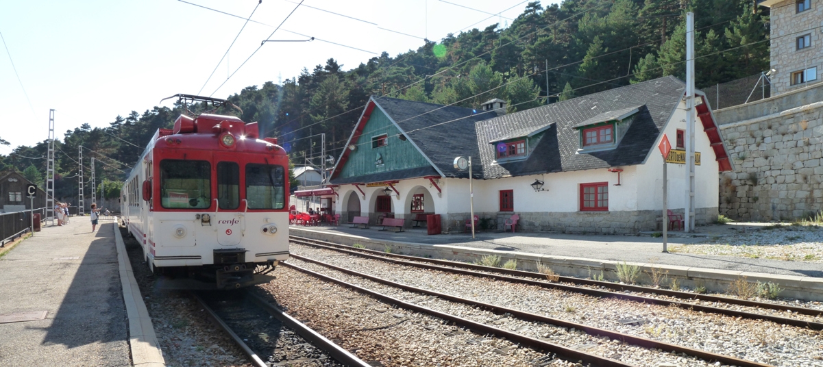 La línia C9 dels trens de rodalia de Madrid uneix les estacions de Cercedilla i Cotos a través del Puerto de Navacerrada, on també hi té parada i des d’on iniciarem la nostra travessa. Es tracta d’un tren de via mètrica (1.000 mm d’ample de via electrificada) inaugurat el 12 de juliol de 1923 pel rei Alfons XII que en un recorregut de 18,7 quilòmetres guanya 664 metres de desnivell. És conegut com el ‘Ferrocarril Eléctrico del Guadarrama’, encara que està explotat turísticament amb el nom de ‘El tren de la naturaleza‘. L’estació final de Cotos, situada a 1.820 m és la més alta d’Europa en adherència, és a dir, en línies ferroviàries que no utilitzen cap sistema de tracció extra com pot ser un cremallera. El tren té vuit estacions, totes facultatives, tret del punt d’inici i final de la línia i del Puerto de Navacerrada, on hi para sempre.