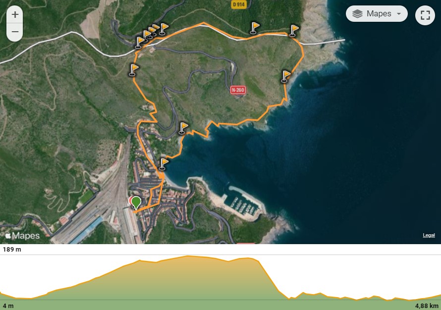 - Ruta: Estació de Portbou – Coll de Belitres – Coll de les Fresses – Puig de Cervera – Platja del Pi – Platja del Búnquer – Platja Petita – Platja de Portbou – Estació de Portbou