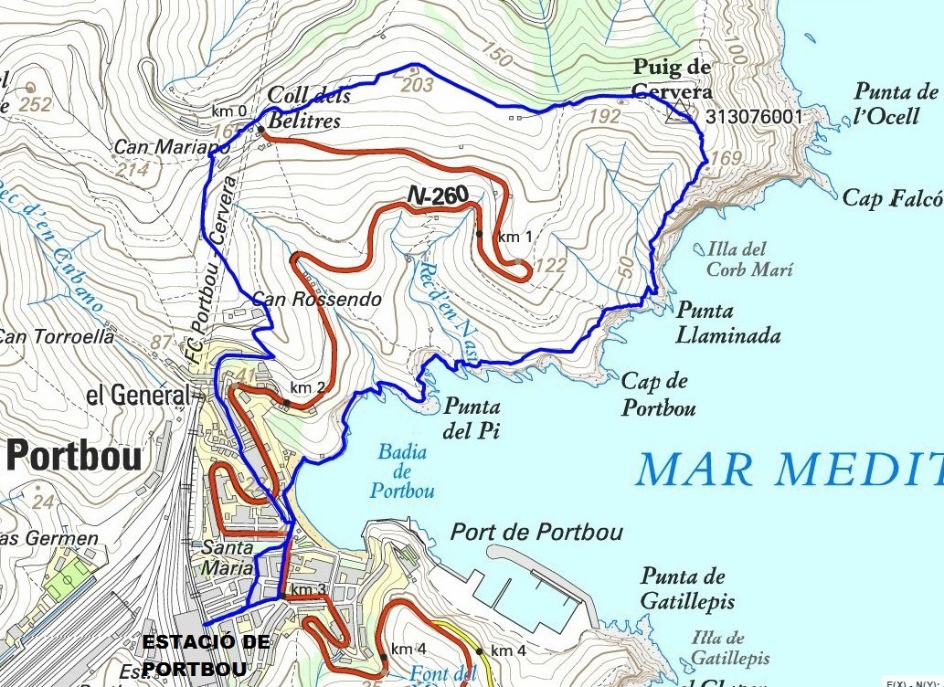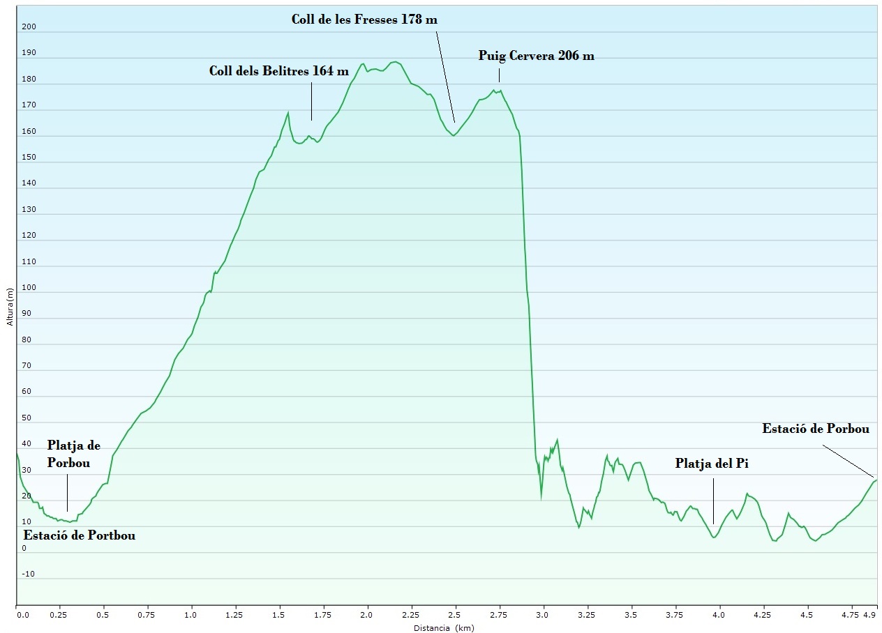 - Ruta: Estació de Portbou – Coll de Belitres – Coll de les Fresses – Puig de Cervera – Platja del Pi – Platja del Búnquer – Platja Petita – Platja de Portbou – Estació de Portbou