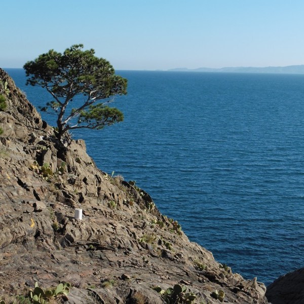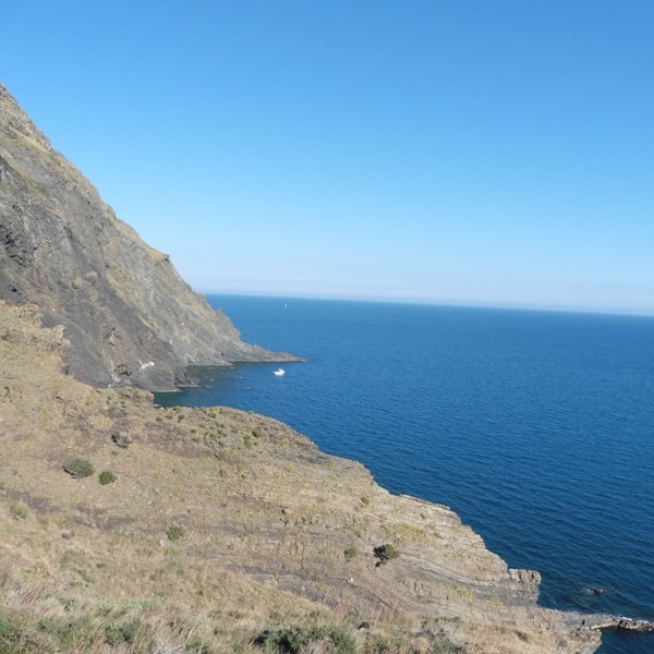Reprenem la ruta seguint un corriol abalisat amb pintura groga que surt del mateix cim vers al nord de baixada cap a Cervera. Som al ‘Sentier Littoral’, un camí de ronda conegut en aquest costat de la frontera com a ‘Sentier du Douanier’. Tot i tenir a tocar a estones els penya-segats, el camí és més fàcil, i tenim els penya-segats més apartats que no els teníem durant la pujada des de Portbou. Tot i així, sempre cal estar atents.