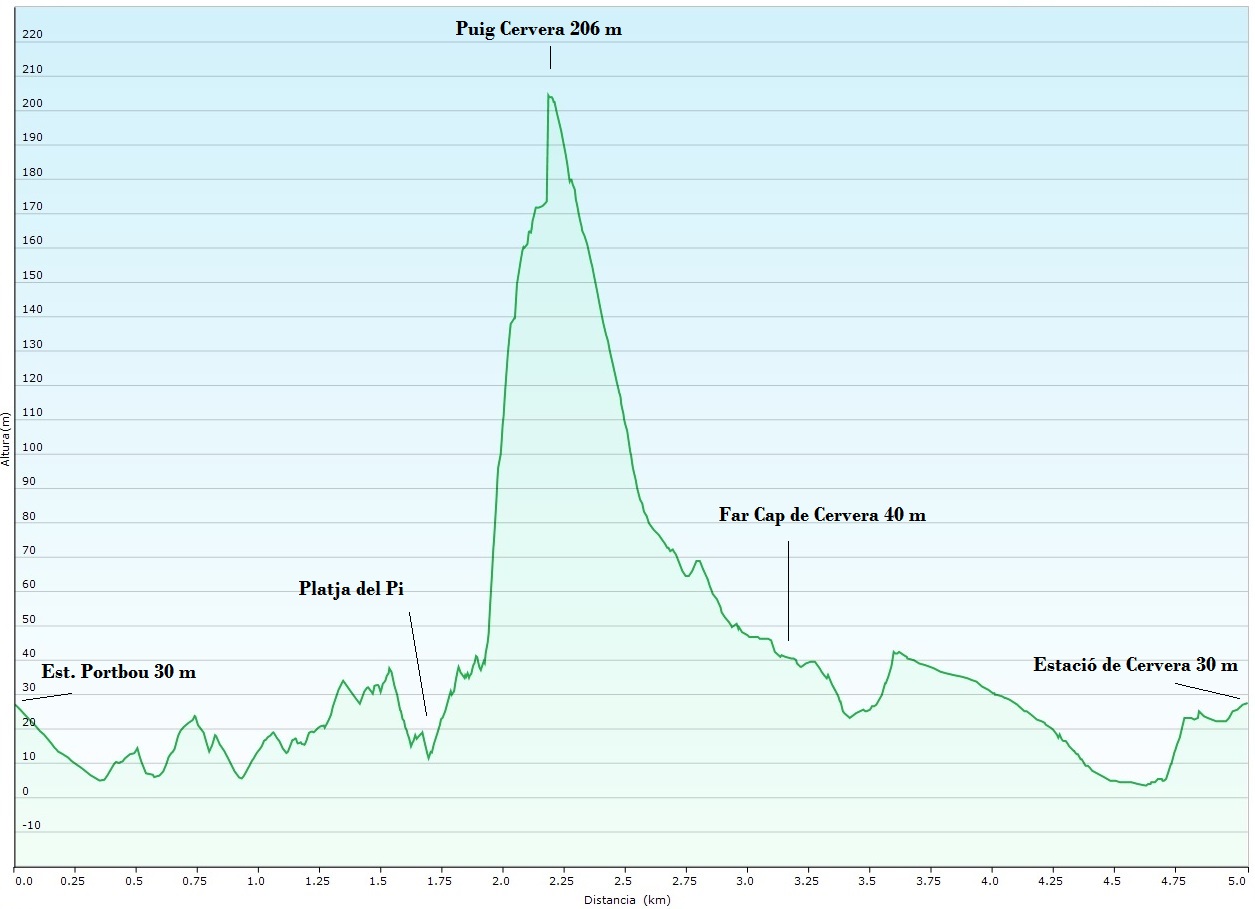 - Ruta: Estació de Portbou – platja de Portbou – platja del Búnquer – Puig Cervera – Far del Cap de Cervera – platja de Cervera – estació de Cervera