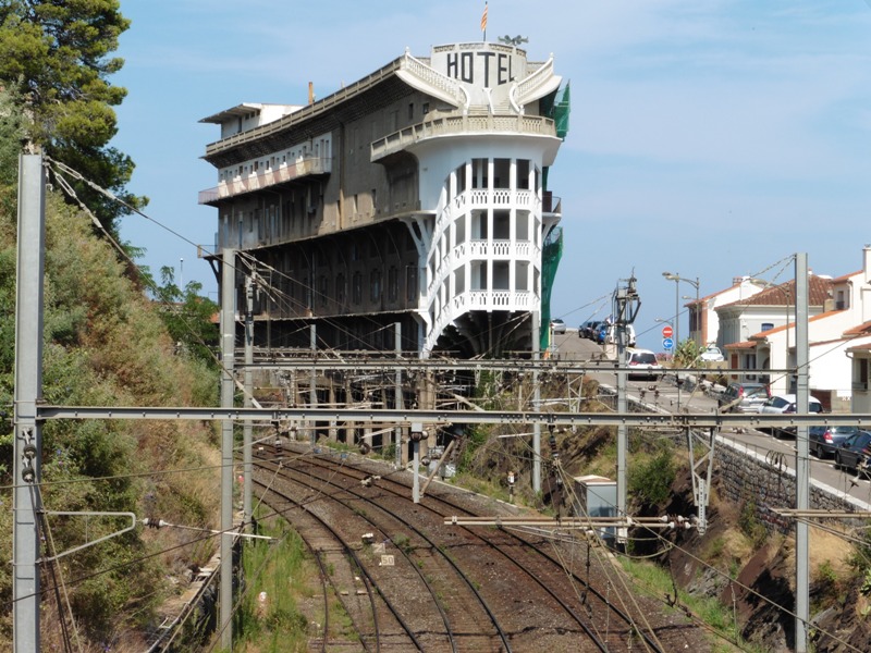 - anar a buscar el pas a nivell (també el pas elevat) que hi ha pujant l’escalinata que puja paral·lel al mur de les vies. Podrem així gaudir de bones vistes de l’antic Hotel Belvédère du Rayon Vert, un antic hotel construït per l’arquitecte perpinyanès Léon Baille entre 1928 i 1932 en estil modernista i amb aparença de vaixell. Tot i el seu abandonament, està protegit com a edifici històric des del 1987.