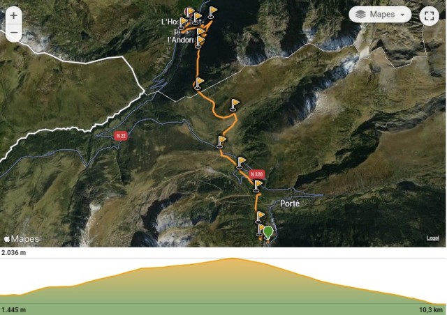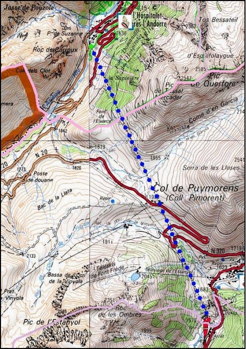 - Ruta: Estació de Porta – rec de Pimorent – cabana – coll de Pimorent – Coma d’en Garcia – avetosa de l’Ospitalet – L’Ospitalet – estació de L’Ospitalet (l’Hospitalet-près-l’Andorre)