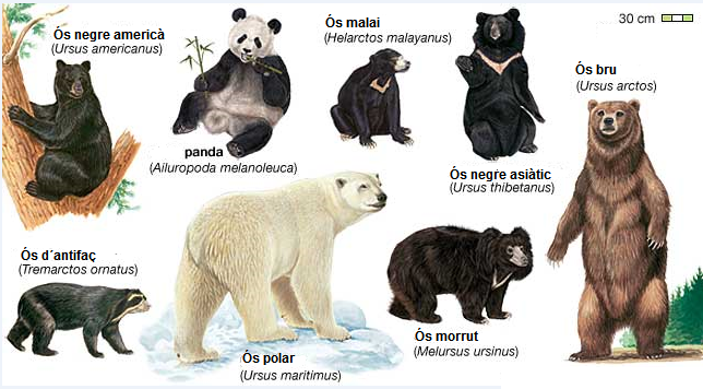 - Ós negre americà (Ursus americanus). Es troba pels boscos d’Estats Units, Canadà, d’Alaska i a Mèxic, essent molt conegut a l’Amèrica del Nord.
