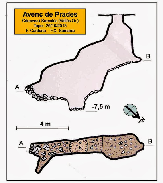 OPCIÓ AVENC DE PRADES: Són 250 metres d’anada i tornada (a afegir a l’itinerari si volem visitar l’avenc. Un camí ample baixa a la dreta (sud) vers l’avenc de Prades (llegir ressenya), una petita cavitat de 7,5 m de fondària. La boca, arran de terra, es troba tapada normalment amb pals de fusta.