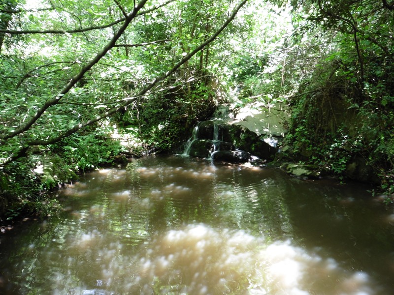 Abandonem la pista asfaltada (Camí de Vallcàrquera) per agafar a la dreta de nou un camí de terra. Als pocs metres creuem la riera de Vallcàrquera per un gual de pedres on, si girem el cap veurem un petit però bonic salt d’aigua. L’espai és força ombrívol, amb un bosc de ribera ben conservat. Seguim el curs de la riera, sempre a la nostra esquerra (S), per un corriol força estret. La riera crea en aquest tram un espai ben fresc a l´estiu, amb petits salts d’aigua i gorges. Al llarg del torrent caminarem per un estret corriol entre un bosc de ribera ben conservat, amb verns, freixes i oms que ens donaran una grata sensació.