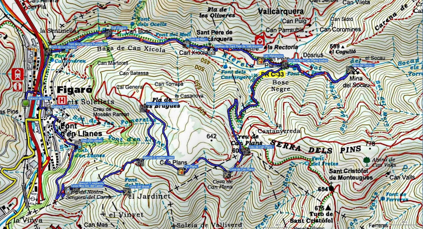 - Ruta: Estació de Figaró – Font de Ca l’Andreu – Pont de Ca l’Andreu – Font de la Noguera Punxaguda – riera de Vallcàrquera – Font del Molí – Sant Pere de Vallcàrquera – Can Xicola – Can Pere Planès – Cova del Socau – Creu de Can Plans – Cova de Can Plans – Can Plans – Pla de les Brugues – Camí de Sant Cristòfol de Monteugues – Cova del Vinyet – Cova de Nostra Senyora del Carme – Font d’en Llanes – església de Sant Rafael – estació de Figaró