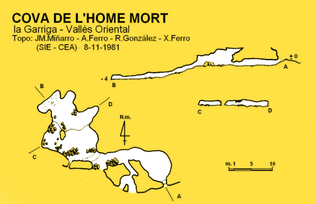 Més coneguda com a Cova de Can Plans, també es coneix amb el nom de Cova de l’Home Mort. Tot i que en origen podria haver estat una cavitat d’origen natural, actualment presenta evidents senyals d’explotació minera. A l’excel·lent web d’Espeleobloc trobareu informació així com millors fotos: Espeleobloc 1; Espeleobloc 2; Espeleobloc 3.