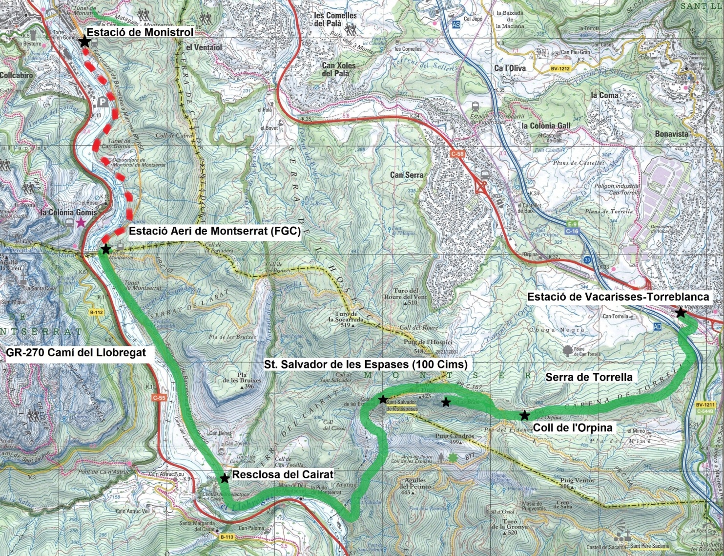 - Ruta: estació de Vacarisses-Torreblanca – Obaga de Can Torrella – Carena de Torrella – Coll de l’Orpina – Coll de la Pedra de la Bossa – Collet de Sant Salvador – Roques de l’Afrau – Coll de Bram – Sant Salvador de les Espases – Torrent de l’Afrau – Font de Sant Salvador – Camí del Llobregat GR-270 – La Puda – Resclosa del Cairat – Pont de l’Aeri – Estació Aeri de Montserrat