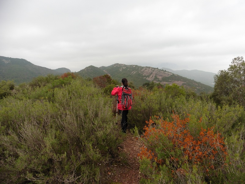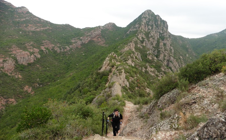 Prenem el sender estret que surt a la nostra esquerra indicat amb un cartell amb una fletxa de ferro (marques de PR) i que comença baixant uns metres per unes escales fetes amb travesses de fusta. El corriol està envoltat de vegetació i és força estètic, envoltant les Roques de l’Afrau pel vessant nord on acabem de pujar. Al fons veiem el nostre objectiu, la piràmide rocosa de Sant Salvador amb l’ermita encimbellada al capdamunt.