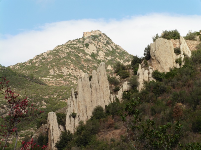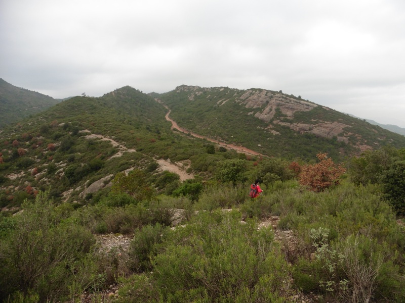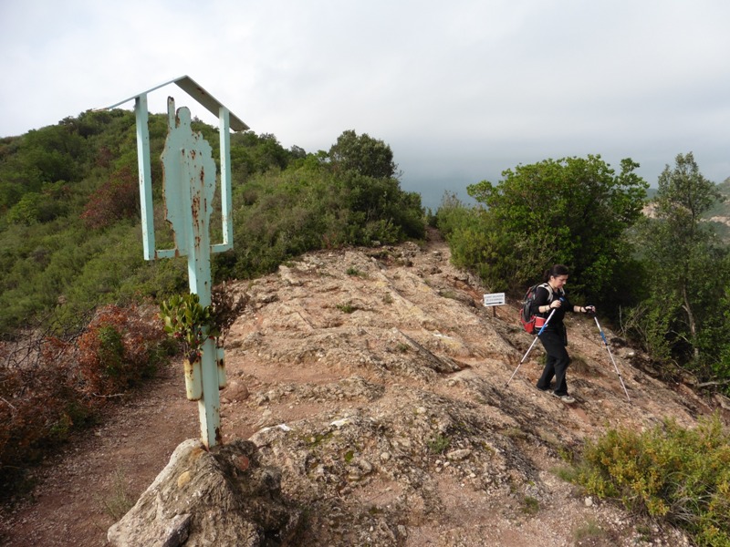 Assolim el cim més alt de la cresta de conglomerats que forma part de la formació de Montserrat. El corriol sembla continuar per l’altre vessant (ponent), però el camí es va complicant fins a fer-se impossible per les retallades crestes. Cal girar cua i tornar a la cruïlla on hem trobat el sender de petit recorregut per a continuar la travessa.