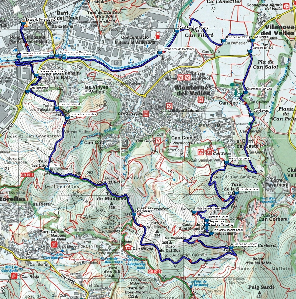 - Itinerri: Estació de Montmeló – passera del riu Besòs – carretera de La Roca – Can Buscarons – El Telègraf – Les Llicorelles – coll de Can Corbera – coll Mercader – turó de Sant Miquel o de Montornès – turó de la Salve – Can Galvany – Ca l’Ametller – Pla de Can Vilaró – Camí Fluvial del Besòs – Font de Santa Caterina – estació de Montmeló