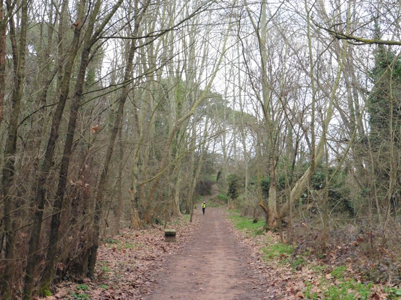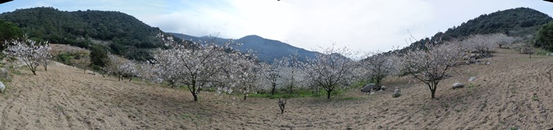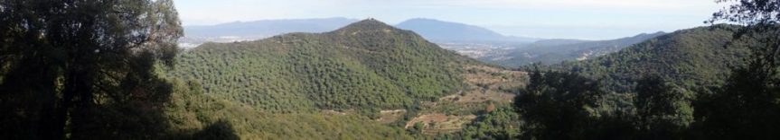 Continuem pel GR-97.3 només 15 metres més per abandonar-lo i prendre un camí a l’esquerra en lleugera pujada. Caminem per una bosquina amb alzines i algun roure amb un sotabosc amb marfull i bruc entre altres espècies per una part del parc que ha patit diversos incendis dels quals es va recuperant de mica en mica. El camí envolta el turó de Sant Miquel pel sud a mitja alçada, amb tendència sempre a l’ascens fins a arribar a les vinyes de Can Barbeta, uns bonics camps de conreu de vinyes i cirerers que omplen de blanc la vall quan entren en floració per primavera.