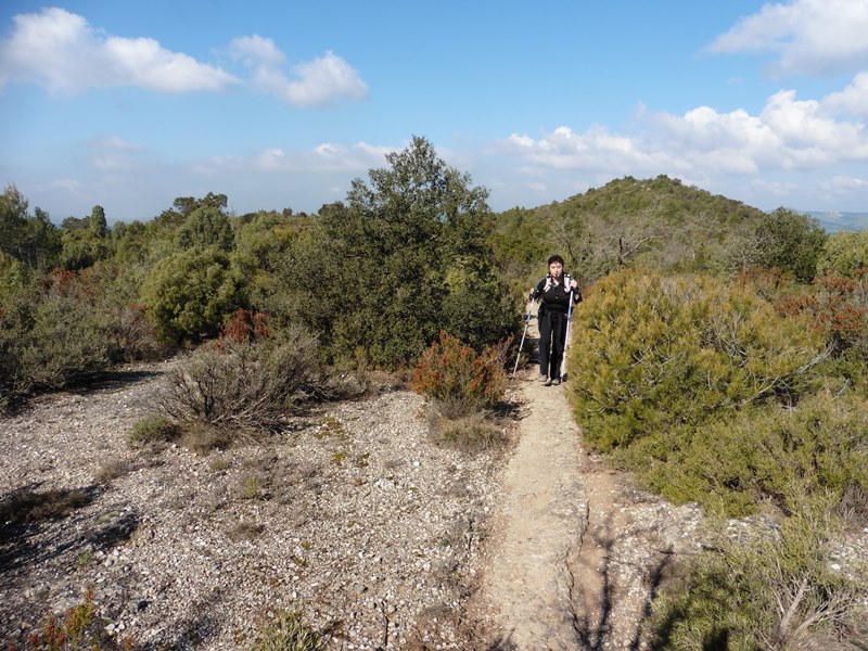 La pista, força ampla, s’enfila fort guanyant alçada entre una pineda de pi blanc, arboç, llentiscle i alguns roures durant 2,3 km, quan trobarem un trencall a l’esquerra del camí indicat amb un pal de seguiment de sender.