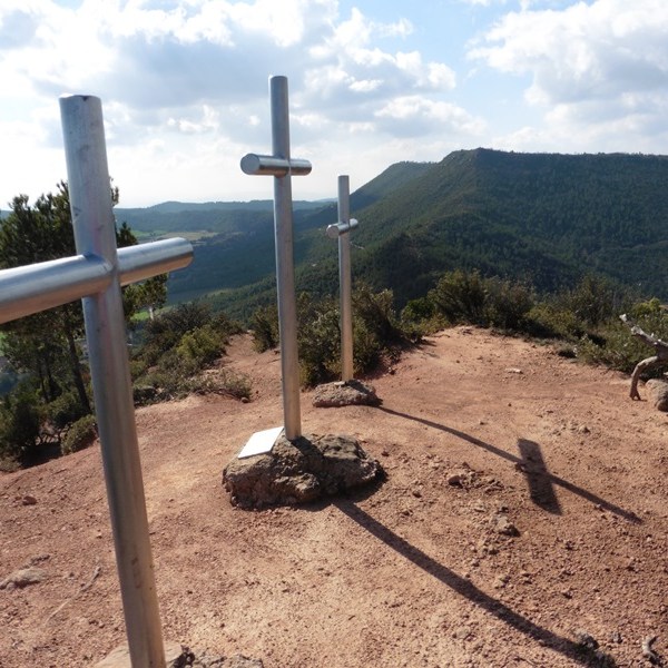 El cim està coronat per tres grans creus d’acer inoxidable. Una placa informa que l’UEC Anoia va renovar les creus el dia 24 de febrer de 1991 i que van ser beneïdes pel rector de Castellfollit del Foix, Mossèn Josep Maria Mas i Busqué.