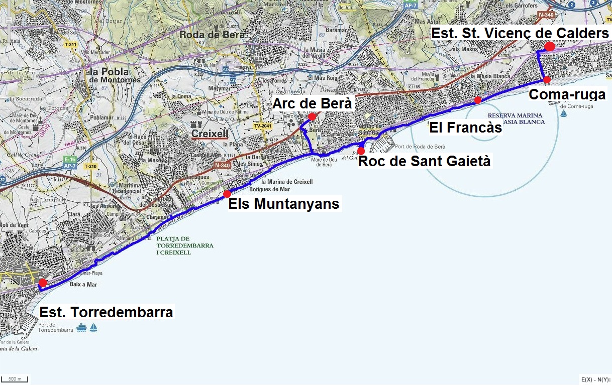 Comencem la ruta sortint de l’estació cap a ponent pel carrer de l’Estació. Després de creuar les vies per un pas inferior, el carrer Víctor Català primer i l’avinguda del Balneari després, ens portaran fins a la platja de Coma-ruga.