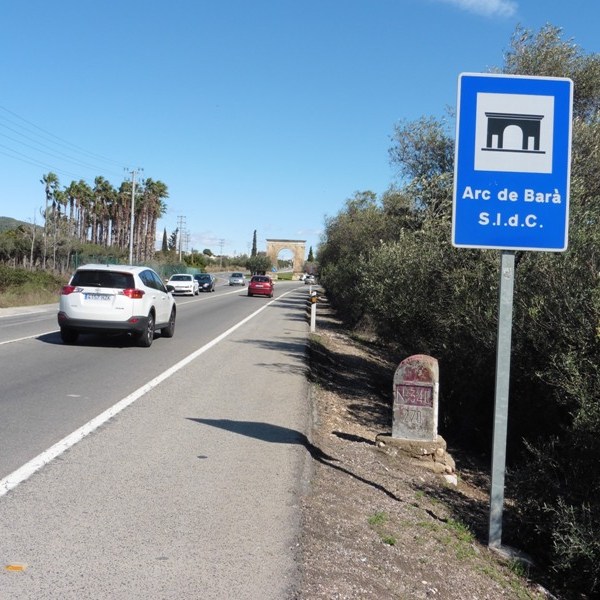 El més perillós serà intentar creuar fins al centre de la rotonda on hi ha l’arc i un plafó explicatiu d’aquest element patrimonial. S’entén, per tant, que es pot arribar fins allí. Però no hi ha passos a nivell ni semàfors, i creuar la N-340 esdevé una perillosa aventura. Compte!