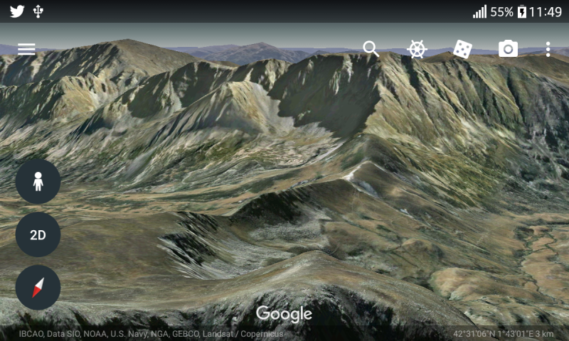 Google Earth sempre és un valor segur. Només consultable online o en caché d’allò que haguem consultat anteriorment. Però ens pot treure de dubtes a l’hora de continuar una excursió o confirmar els cims del nostre entorn gràcies a la seva magnífica visió de 360º.
