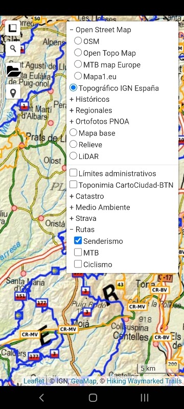 Aplicació pràctica a l’hora de consultar la nostra posició sobre infinitat de capes de mapes. Si despleguem el menú de ‘Regionales’ tenim a la nostra disposició el mapa de l’ICGC, molt útil quan estem caminant per Catalunya. Molt útil és la capa de ‘Senderismo’.