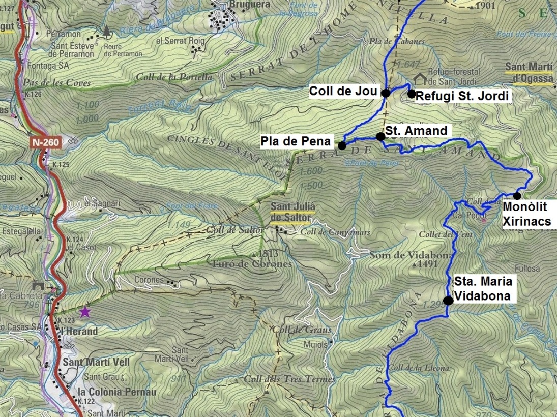 - Interès: El camí carener fins al cim de Sant Amand, així com la visita de les ruïnes del Santuari de Vidabona.