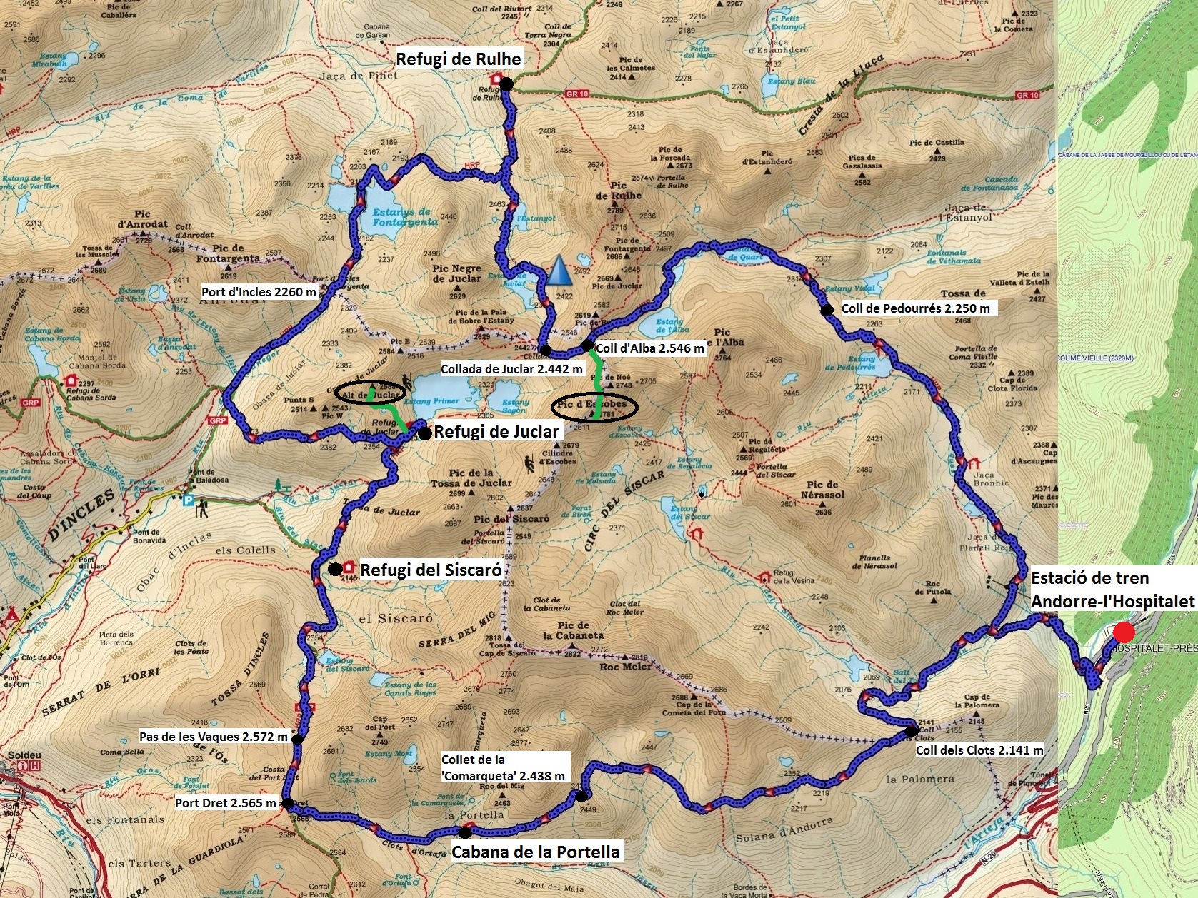 Us proposem una ruta circular amb inici i final a l’estació de ferrocarril d’Andorre-l’Hospitalet (SNCF) que durant tres o quatre jornades (42 km) us portarà a caminar entre els grans cims pirinencs d’Andorra i França. I per fer-ho resseguirem en tot moment el GRT 2 La Volta als estanys, un sender de gran recorregut fronterer (marques blanques i vermelles) que visita bona part dels estanys que s’amaguen en aquesta zona poc coneguda però plena de valls de gran bellesa i solitud dels Pirineus orientals. La ruta aprofita per a fer nit en els dos únics refugis guardats que trobarem, el de Rulhe i el de Juclar, però també passa a tocar de dos refugis lliures andorrans, els de la Cabana de la Portella i el refugi de Siscaró, que es poden aprofitar per dividir una de les etapes per fer-la més fàcil i accessible. En aquest darrer cas caldrà carregar un matalàs i un sac per passar la nit en un d’aquests refugis lliures.