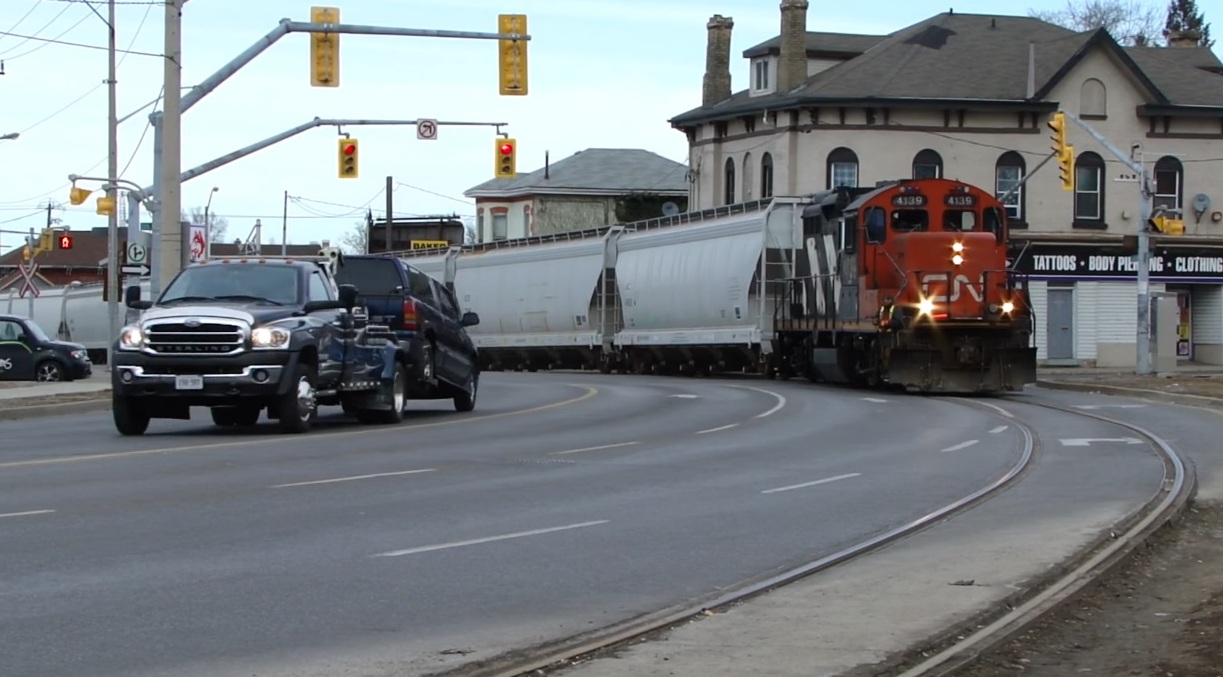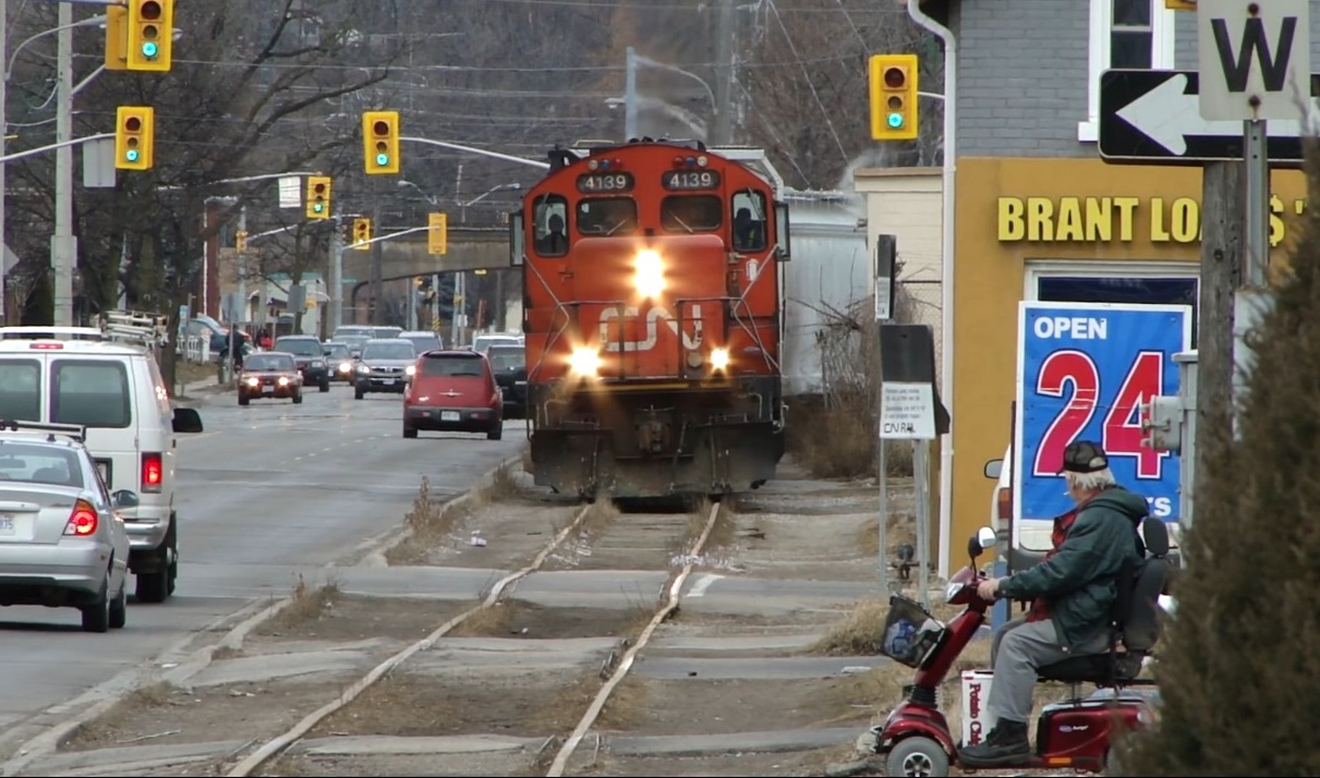Petita ciutat de 90.000 hab. situada a la costa est, prop de les catarates Niàgara. El ferrocarril comparteix l’espai públic amb harmonia amb la ciutat. A destacar la segona foto, on un avi que condueix una cadira elèctrica, s’espera el pas del tren.