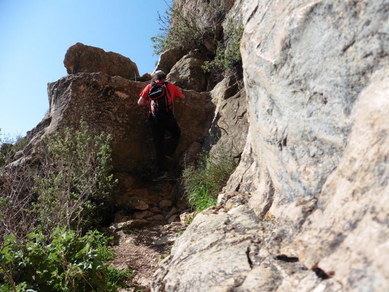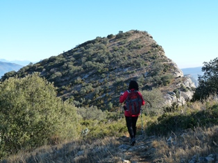 En una lleugera collada deixem el camí principal (fites de pedra) per seguir un corriol a la dreta que puja per un camí incòmode i embardissat amb garrics fins pràcticament arribar al caire del cingles del vessant nord abans d’assolir el cim del Mont-roig.