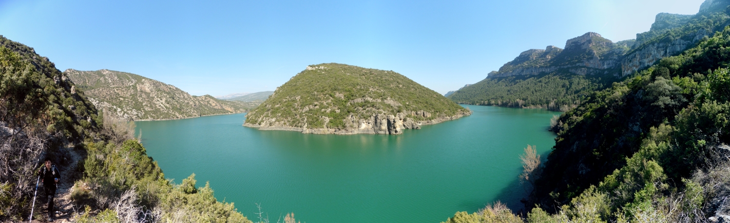 El riu Noguera Pallaresa fa un gran revolt envoltant el darrer contrafort de la Rendisclera de la Maçana (cingle situat al vessant est del pantà). Des de la perspectiva que tenim, aquest meandre cobert ara sota les aigües del pantà de Camarasa dóna la sensació que la Rendisclera sigui una illa enmig de les aigües. Al vessant oest del riu ens apareixerà Lo Cinglo Roig, muntanya que conserva encara dalt del seu cim vestigis de la Guerra Civil, amb casamates construïdes pels nacionals durant les batalles del Front del Segre.
