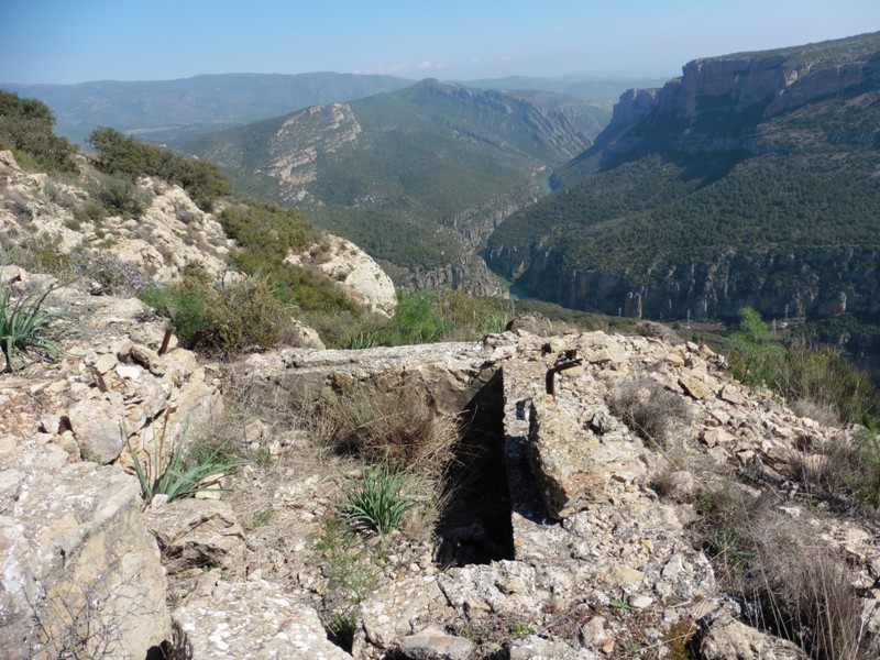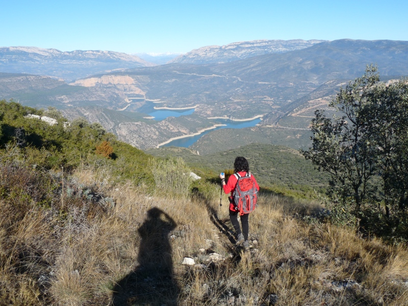 Retornem de nou a la cruïlla per on hem baixat del cim del Mont-roig. D’aquí cal prendre el camí en direcció nord seguint un corriol en descens i amb vistes cap a l’espectacular congost de Mu, l’estret obert pel riu Segre als cingles abans no arriba a l’aiguabarreig Segre-Noguera Pallaresa.
