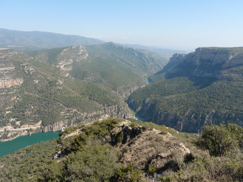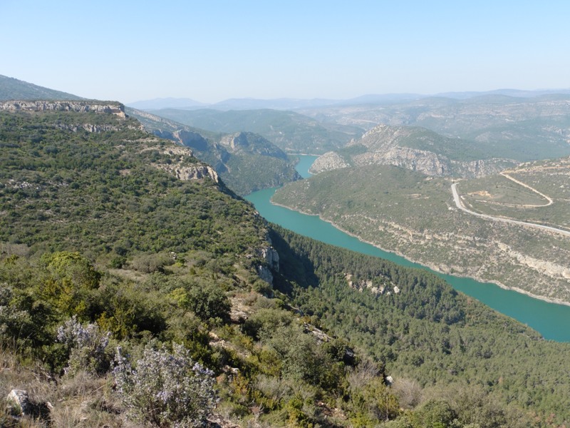 En primer terme veiem el pantà de Camarasa amb el cingles de la Rendisclera de la Maçana i l’espectacular Congost de Mu, tall obert pel Segre de camí a l’aiguabarreig Segre-Noguera Pallaresa.