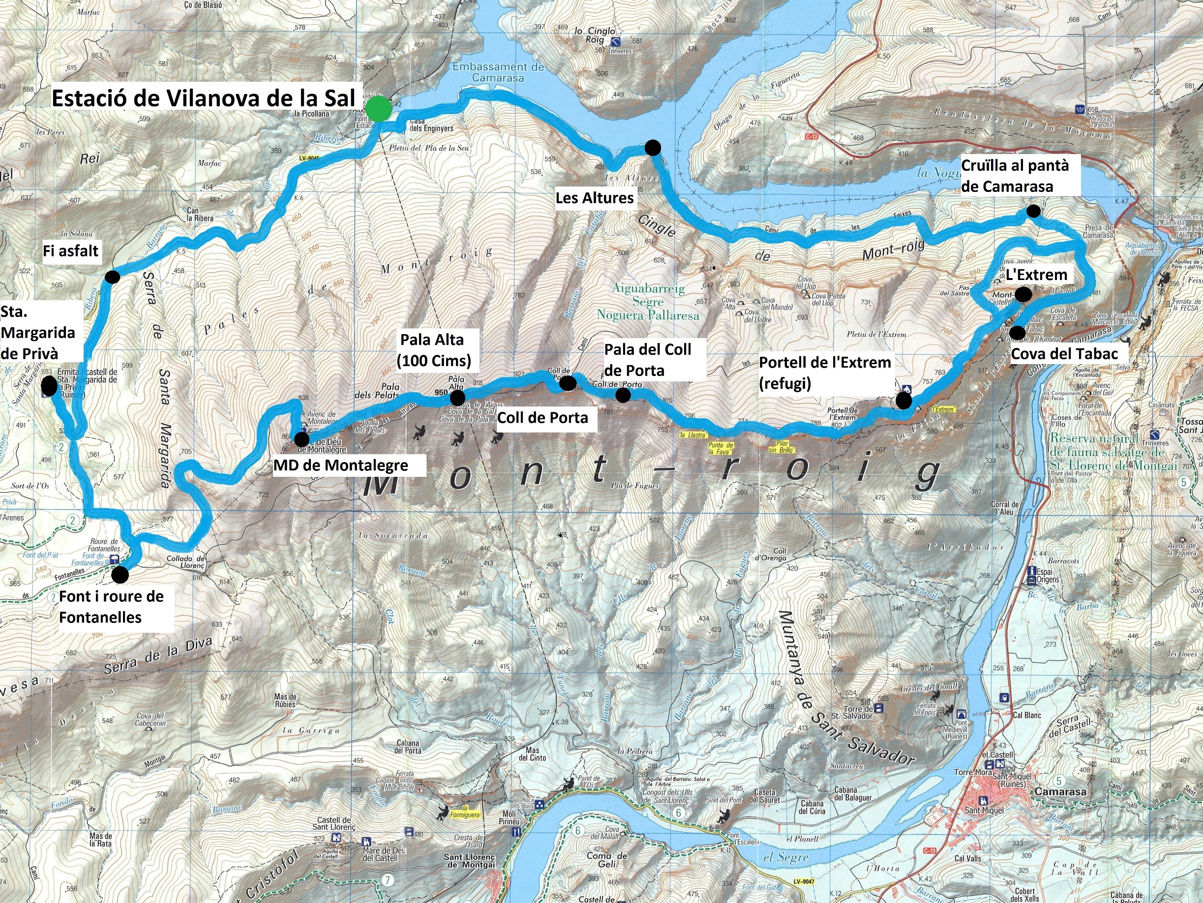 Espectacular ruta circular que recorre completament la carena de la Serra de Mont-roig des de l’estació de tren de Vilanova de la Sal tot visitant bona part dels al·licients que s’hi amaguen, entre els quals destaquem les ruïnes de Santa Margarida de Privà, la Pala Alta (100 Cims), la Punta de l’Extrem (100 Cims) i la Cova del Tabac.