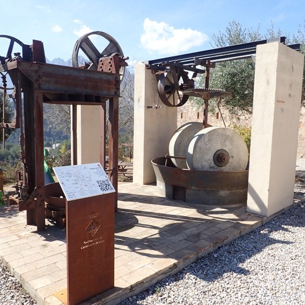 A excepció dels cups de decantació, les corretges i la batedora, aquests elements s’han collat en una solera de ciment recoberta de maó pla. A un dels extrems hi ha un plafó explicatiu. A mà dreta del trull s’hi ha plantat una olivera, que creix ufanosa.”
