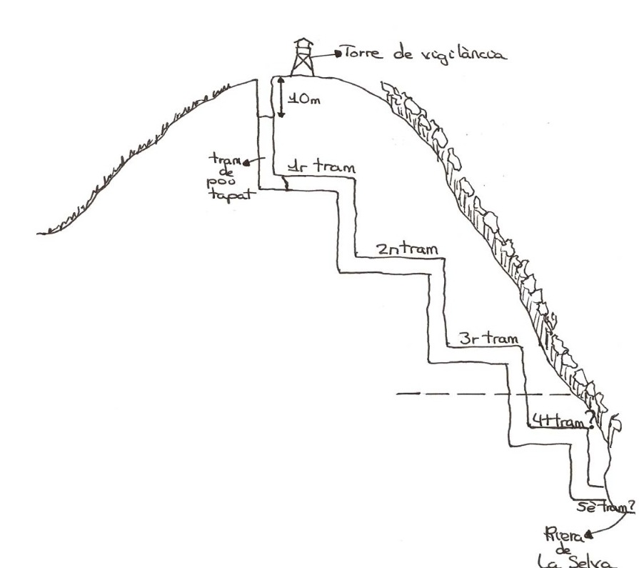 [mina] Prop de la torre hi ha la boca de la mina ‘Aurora’, una antiga explotació de galena que data de 1842. Havia d’arribar des del cim del Puig d’en Cama fins a la riera de la Selva formant un conjunt esglaonat de pous i galeries. S’ha explorat fins al tercer esglaó i no se sap del cert si es arribar fins a nivell de la riera.