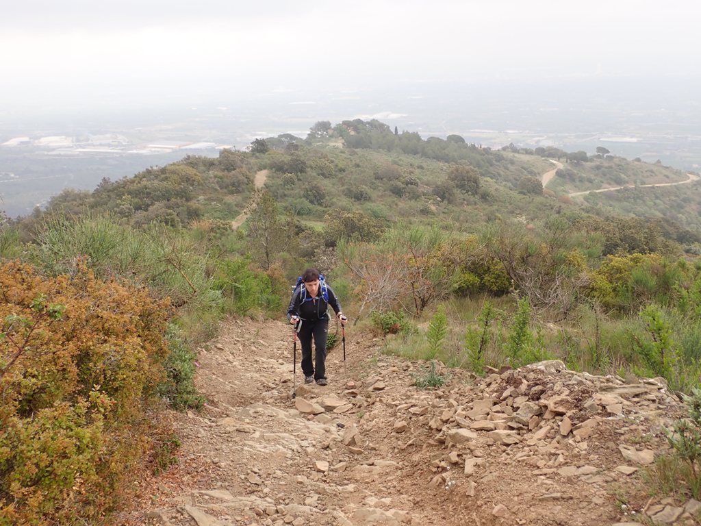 De nou a la cruïlla, baixem vers el vessant nord del puig entre vegetació baixa fins a desembocar al Camí dels Banyadors, una pista no gaire agradable de fer pels trams cimentats. Perdem alçada amb rapidesa baixant pel vessant nord de la muntanya, amb vistes cap al Tossal de les Forques i les Muntanyes de Prades al nostre front.