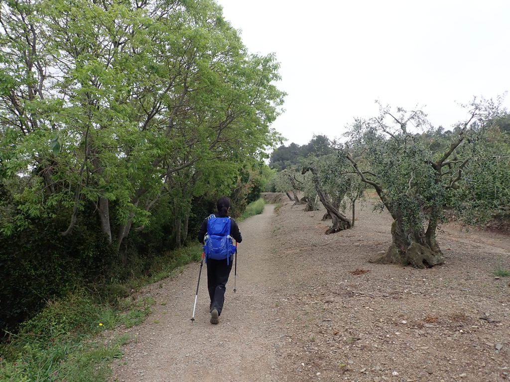 Deixem el molí enrere i seguim les indicacions del SL C-155 cap a Sant Pere, sender local que s’enfila guanyant alçada ràpidament fins a l’ermita a través de camps de conreu amb oliveres i ametllers a través d’un llarg tram de camí cimentat.