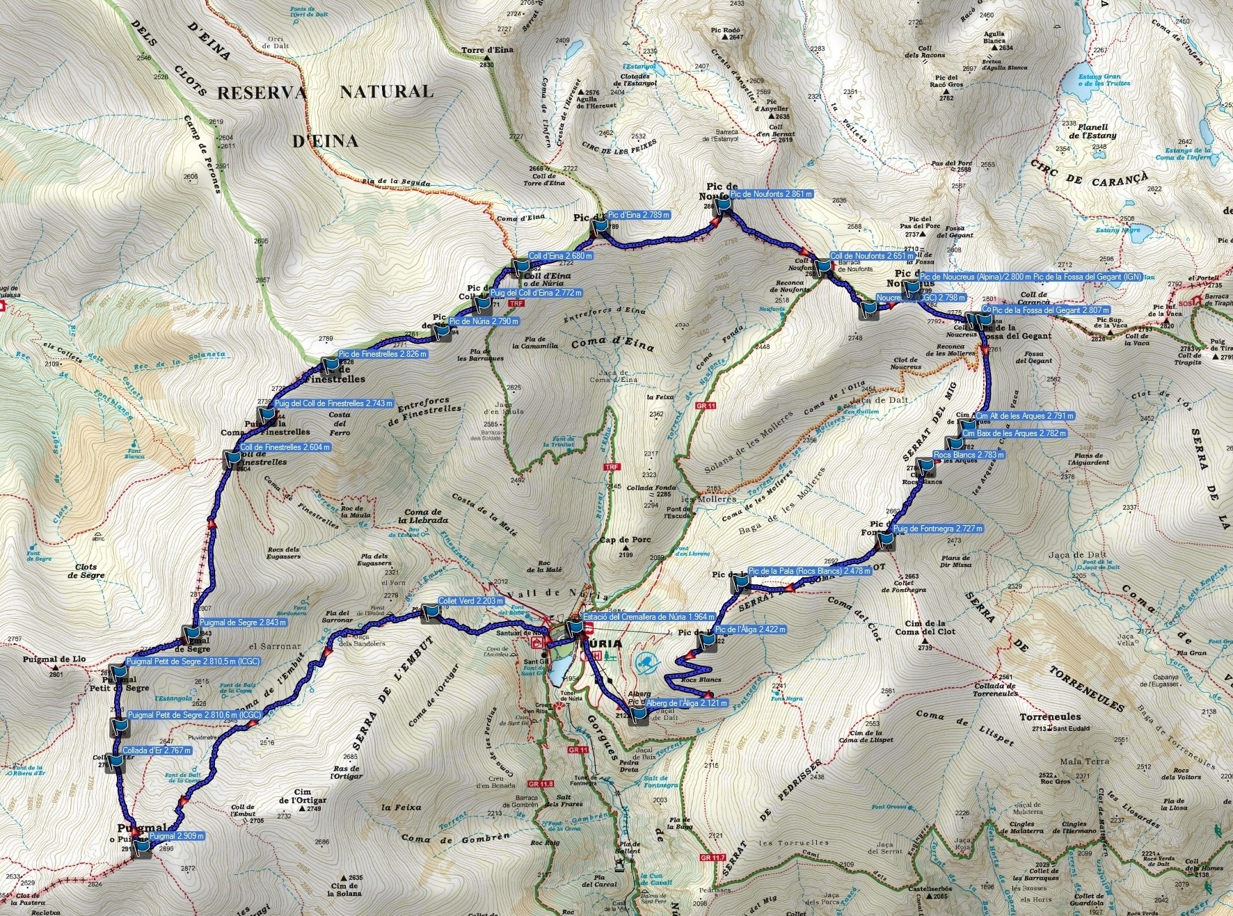 - Cims assolits: (3) Pic de Núria 2.790 m ; Pic del Coll d’Eina 2.772 m ; Pic d’Eina 2.789 m.