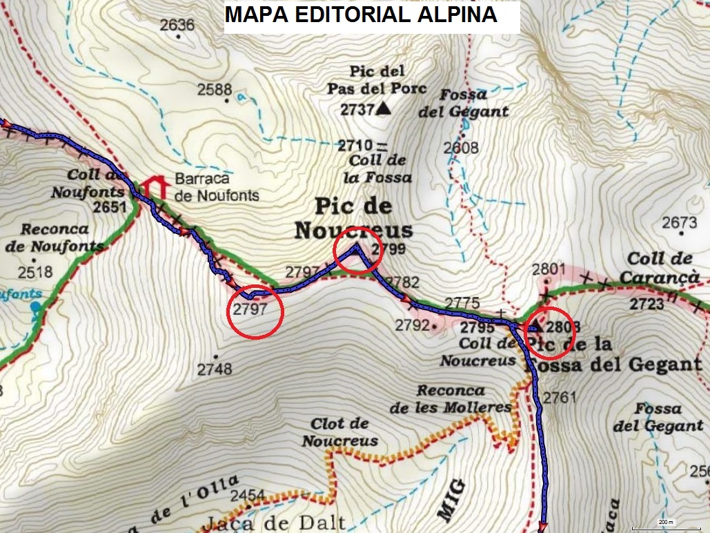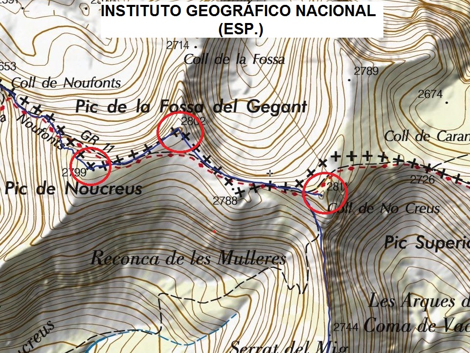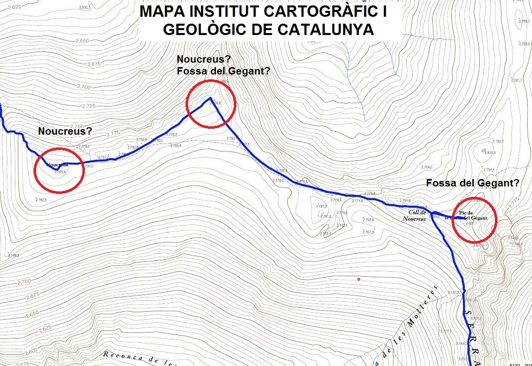 El “Noucreus 2.800 m” és un altre d’aquells cims on les topografies no són coincidents entre diferents mapes. L’ICGC català i l’IGN espanyol situen aquest cim en una primera cota de 2.798,4 m (utm 31T 432569 4696534). Els mapes Alpina en un punt superior, cota 2.800,6 m, situat 340 m al nord-est de l’anterior (31T 432882 4696676). Per acabar-ho d’enredar, els mapes IGN francesos i els IGN espanyols anomenen a aquest darrer cim Pic de la Fossa del Gegant (enlloc de Noucreus) i que els mapes catalans (ICGC i Alpina) situen més a llevant.