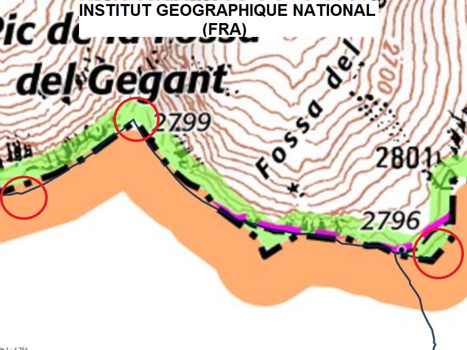 - PIC PETIT DEL SEGRE (SUD): tots els mapes situen el cim del Pic Petit del Segre en una cota (dades ICGC) de 2.810,5 m (31T 427148 4693968) a tocar del cordal que l’uneix amb el Puigmal de Llo. Però 640 metres al sud hi ha una altra cota de 2.810,6 m (31T 427156 4693583) amb una collada pel nord de 2.794,3 m (preeminència de +16,1 m) i una segona collada pel sud que el separa del Puigmal de +42,9 m. Per tant, d’acord amb la ‘norma’ utilitzada pels 3.000, i atès que el punt superaria els 10 m mínims de preeminència, podríem considerar cim amb entitat a aquesta cota. No hem trobat cap denominació per a aquesta cota i desconeixem si se’n fa esment en algun altre lloc, uns criteris que es tenen també en compte (en el cas de la llista dels 3000) a l’hora de declarar un cim com a nou.