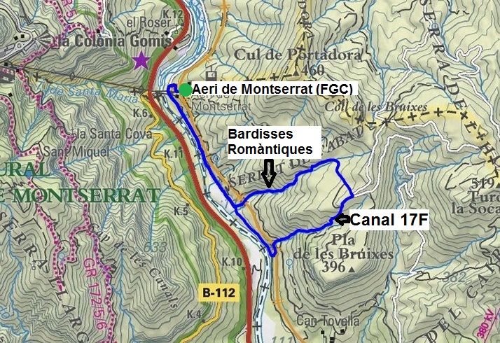 Travessa circular que des de l’estació d’Aeri de Montserrat dels FGC ens portarà a conèixer les canals de les Bardisses Romàntiques i 17F, dos camins equipats que ressegueixen dues torrenteres situades entre Olesa de Montserrat i Monistrol de Montserrat que baixen des de la serra del Cul de Portadora fins al riu Llobregat.