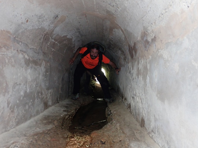 El camí s’obre, punt on abandonem el còmode camí que seguíem per prendre a l’esquerra un corriol que ens porta fins al col·lector que vessa les aigües del torrent per on puja la canal de les Bardisses Romàntiques fins al Llobregat. Caldrà portar frontal o llanterna, atès que és llarg, fosc i de petja irregular. Si ha plogut fa poc, encara retindrà una mica d’aigua en el seu interior.