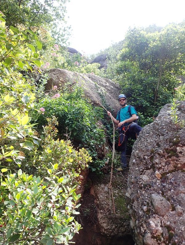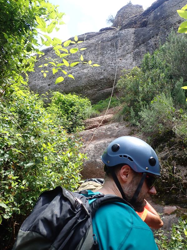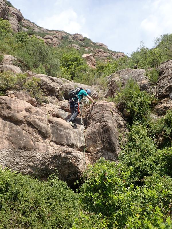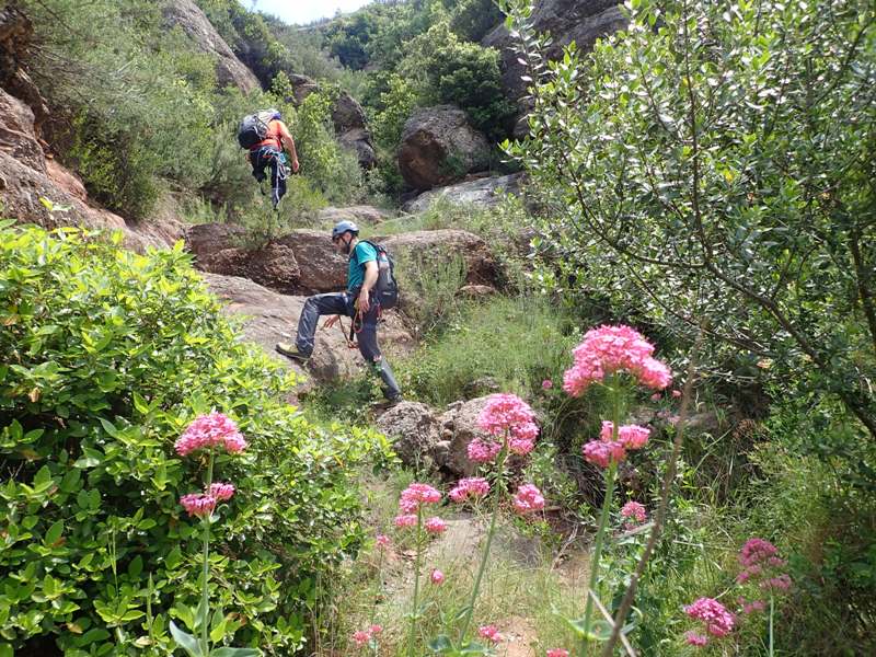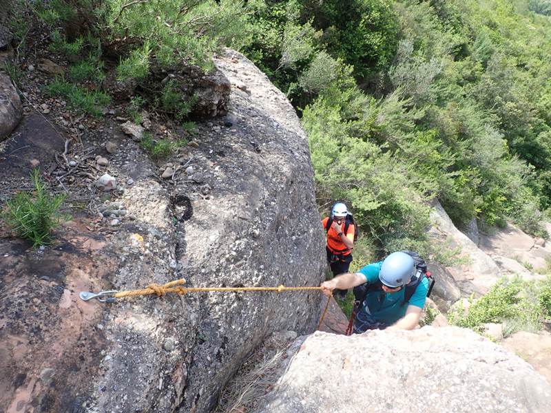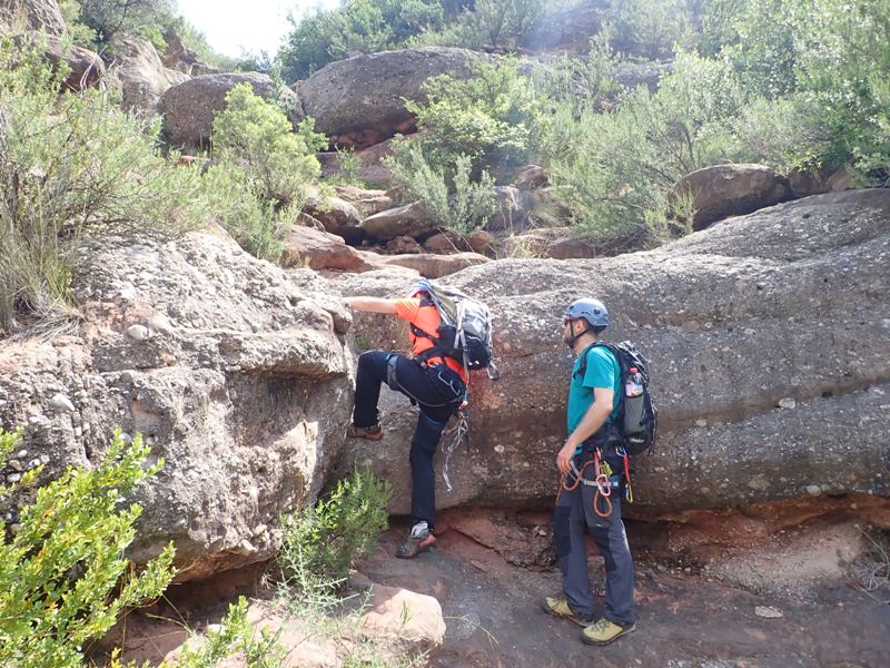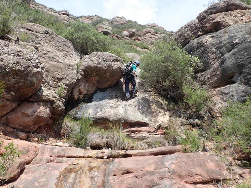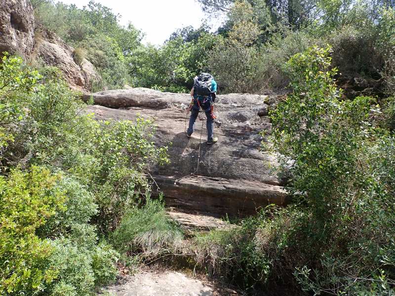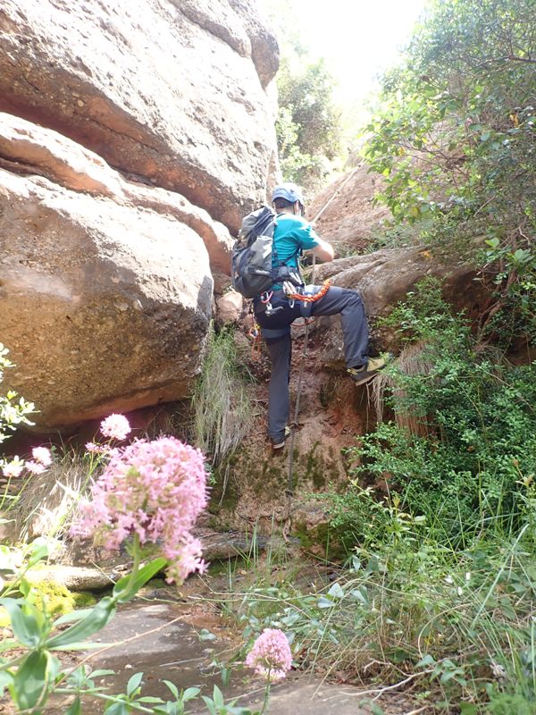 Ajudats de cordes nuades i claus de ferro anirem superant ressalts del torrent sense gaire problemes. Superem un ressalt vertical de 6/7 metres amb bones preses abans d’arribar al ressalt de màxima dificultat de la ruta, un ressalt doble format per un primer pla inclinat i un segon, vertical, de 4/5 m. El primer és relativament fàcil de superar, però el segon requereix de força de braços i de fer un bon joc de peus sobre les clavilles de ferro, atès que ens hem de decantar cap a l’esquerra a fi de superar el pas.