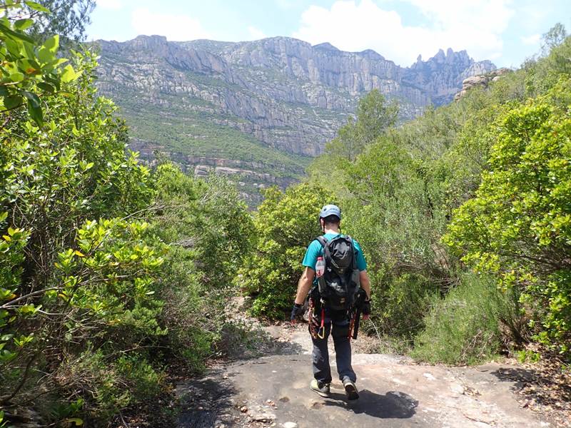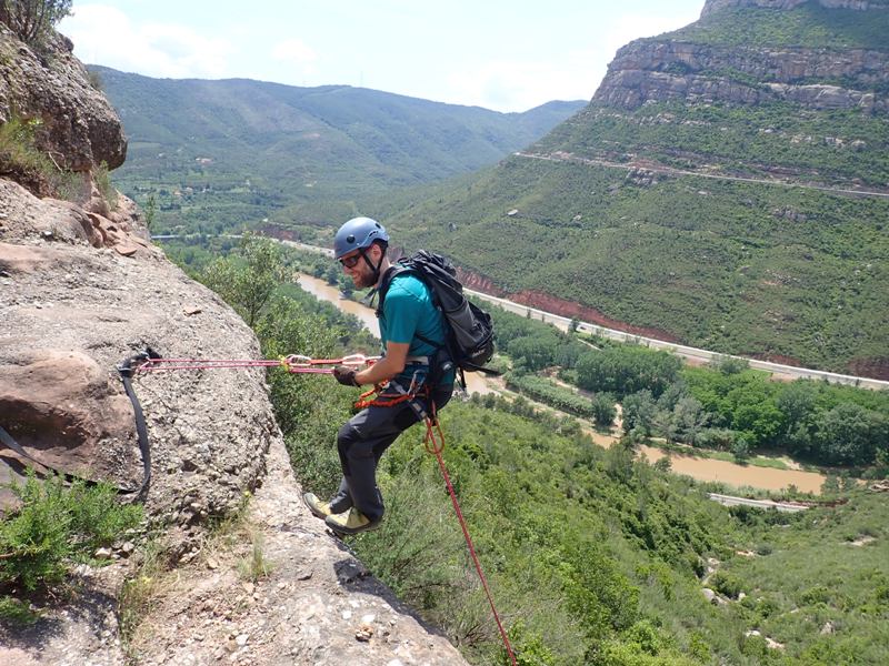 Cal portar casc, arnés i vaga d’ancoratge. També una corda de 30 m que ens servirà tant per assegurar algun pas, com per rapelar la baixada.